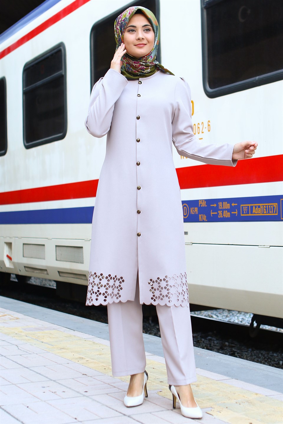 Product ID: FHM620 Click Here for more information about Returns Procedure Fabric: %100 crepe Season: 4 seasons Detail: tunic - pants - 2 piece suit Items excluded: instant shawl Lining: unlined Collar: high collar Fit: regular Product lenght: pants - 103 cm / tunic - 108 cm (hollow to floor) Size of the item on the image Chest: 88cm Waist: 76cm Hips: 94cm '' 4cm '' difference between sizes. Size Chart Delivery: The item is given to delivery within '' 24 hours ''